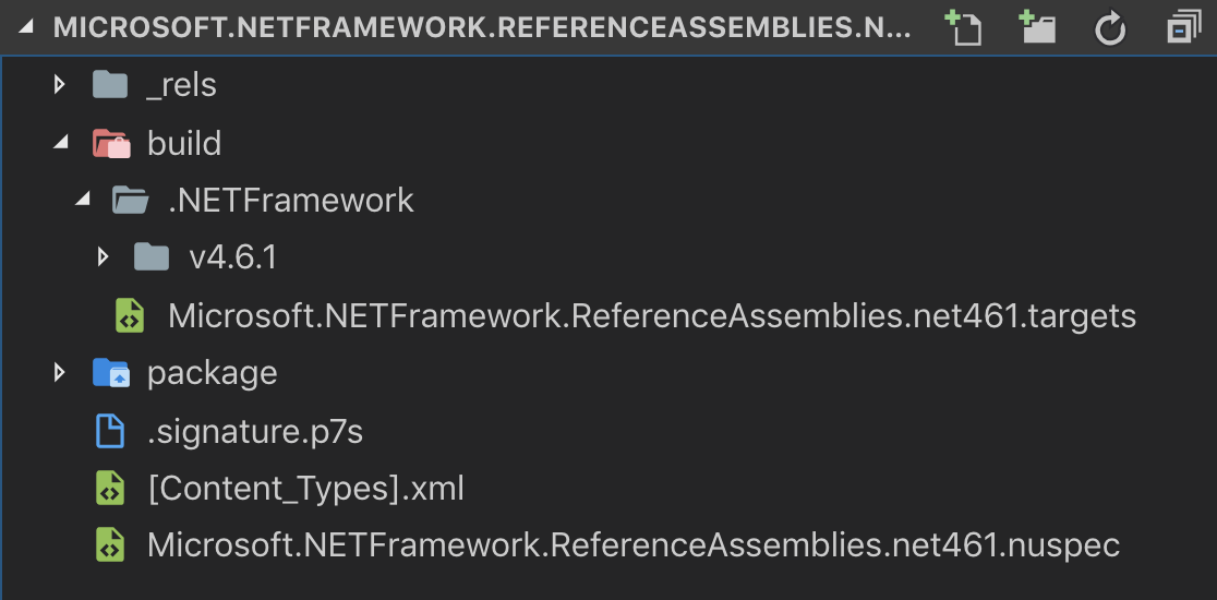 The build/.NETFramework/v4.6.1 folder contains the reference assemblies, and the Microsoft.NETFramework.ReferenceAssemblies.net461.targets file looks like this: