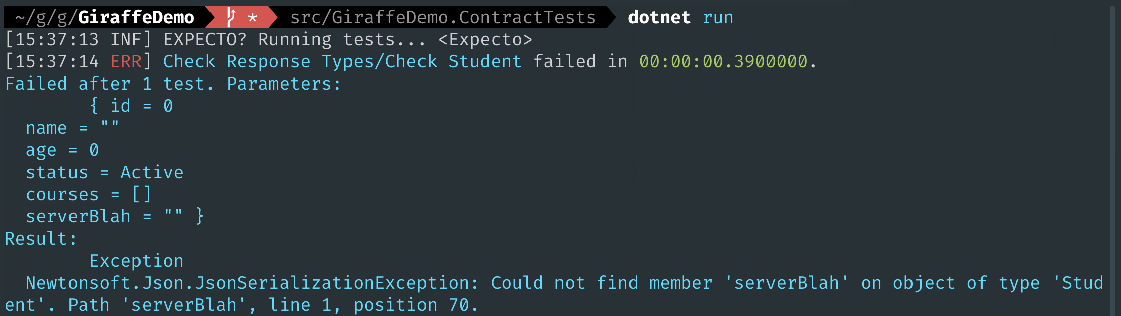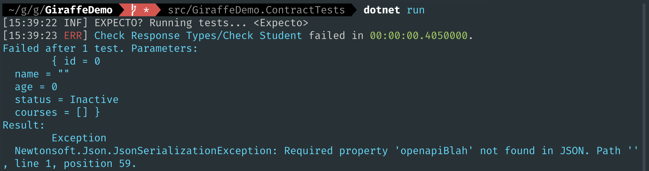 I could write a unit test that serializes an arbitrary web app Student and deserializes it with a client generated Student. Json.NET has a feature that is handy here, and that's MissingMemberHandling = MissingMemberHandling.Error—with this setting if we have a property in the serialized JSON (and therefore in the web app) and missing from the client type (and therefore the OpenAPI spec file), then it will throw an exception.